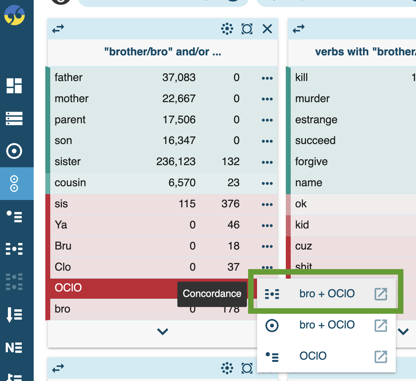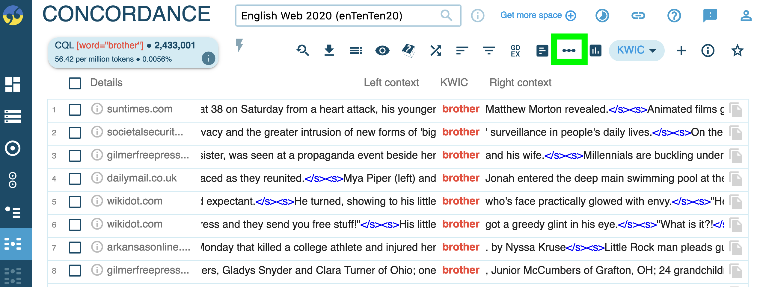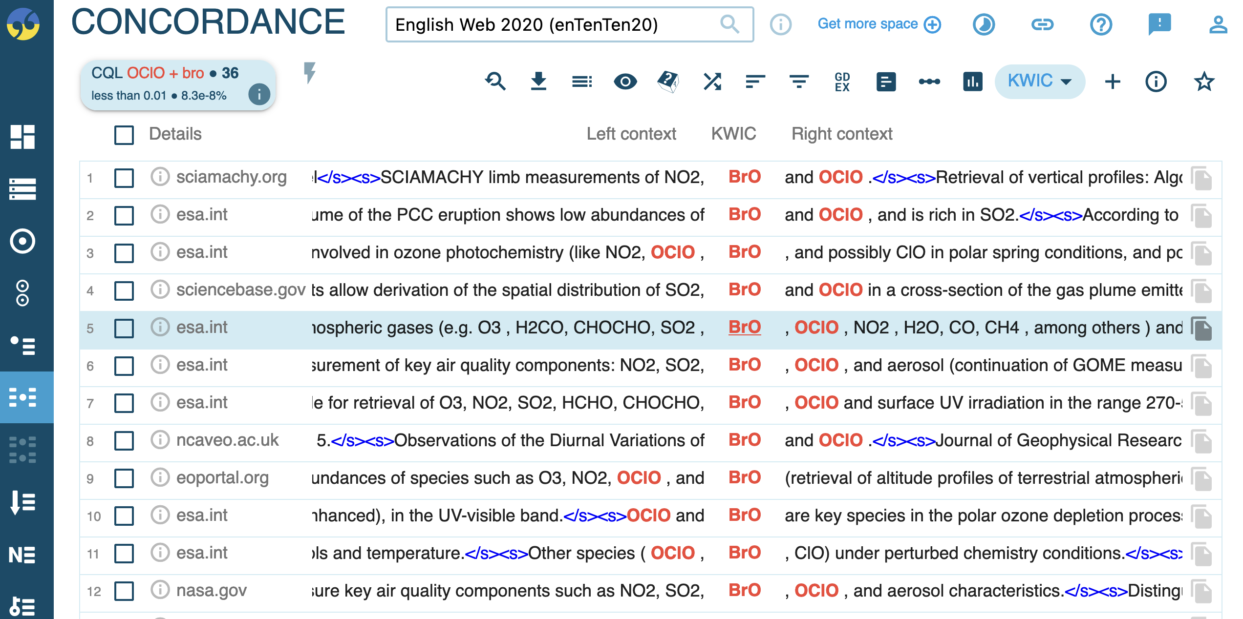 - Run a query to retrieve all occurrences and get a concordance view (e.g.,