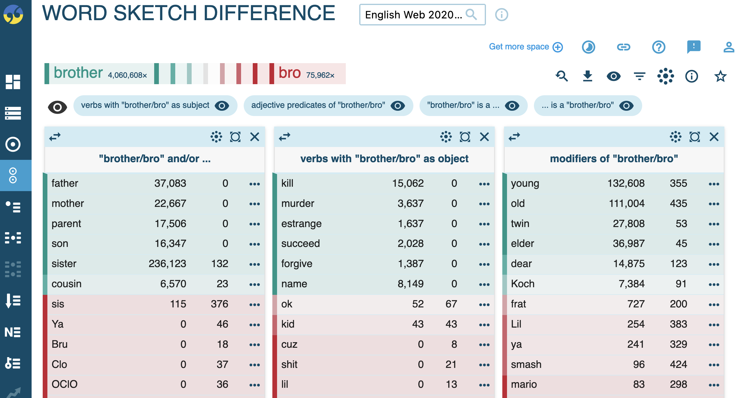 [lemma="brother" & tag="N.*"] - record absolute and relative frequency