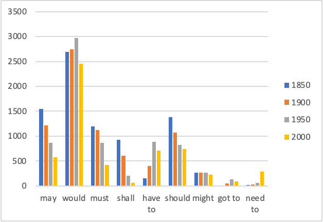 text type/register variation: e.g., modal verb frequency in academic vs. fiction