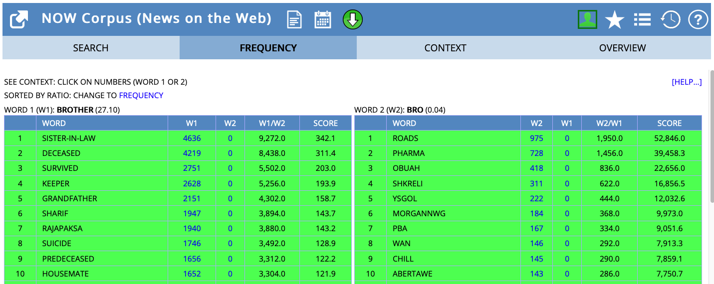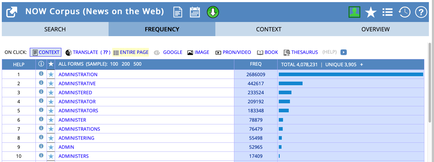 Query admin* in the NOW corpus (list view)