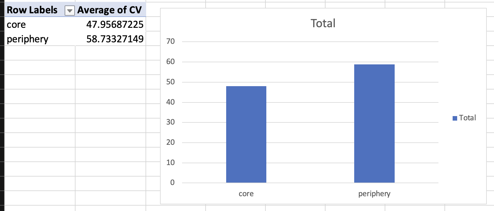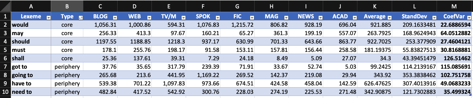 Coefficient of variation for groups of modals: core vs peripheral.