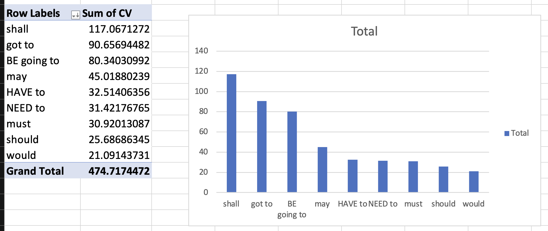 =AVERAGE(range)=STDEV.S(range)=(STDEV/MEAN)*100Frequency changes for may and would.