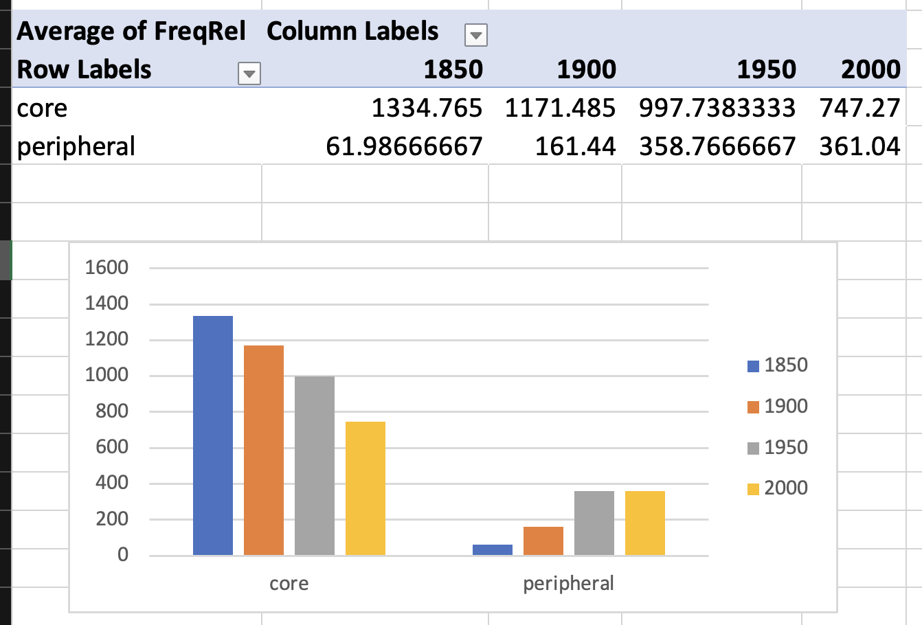 Frequency changes across modal types: core vs peripheral.