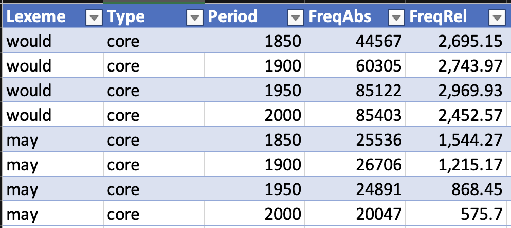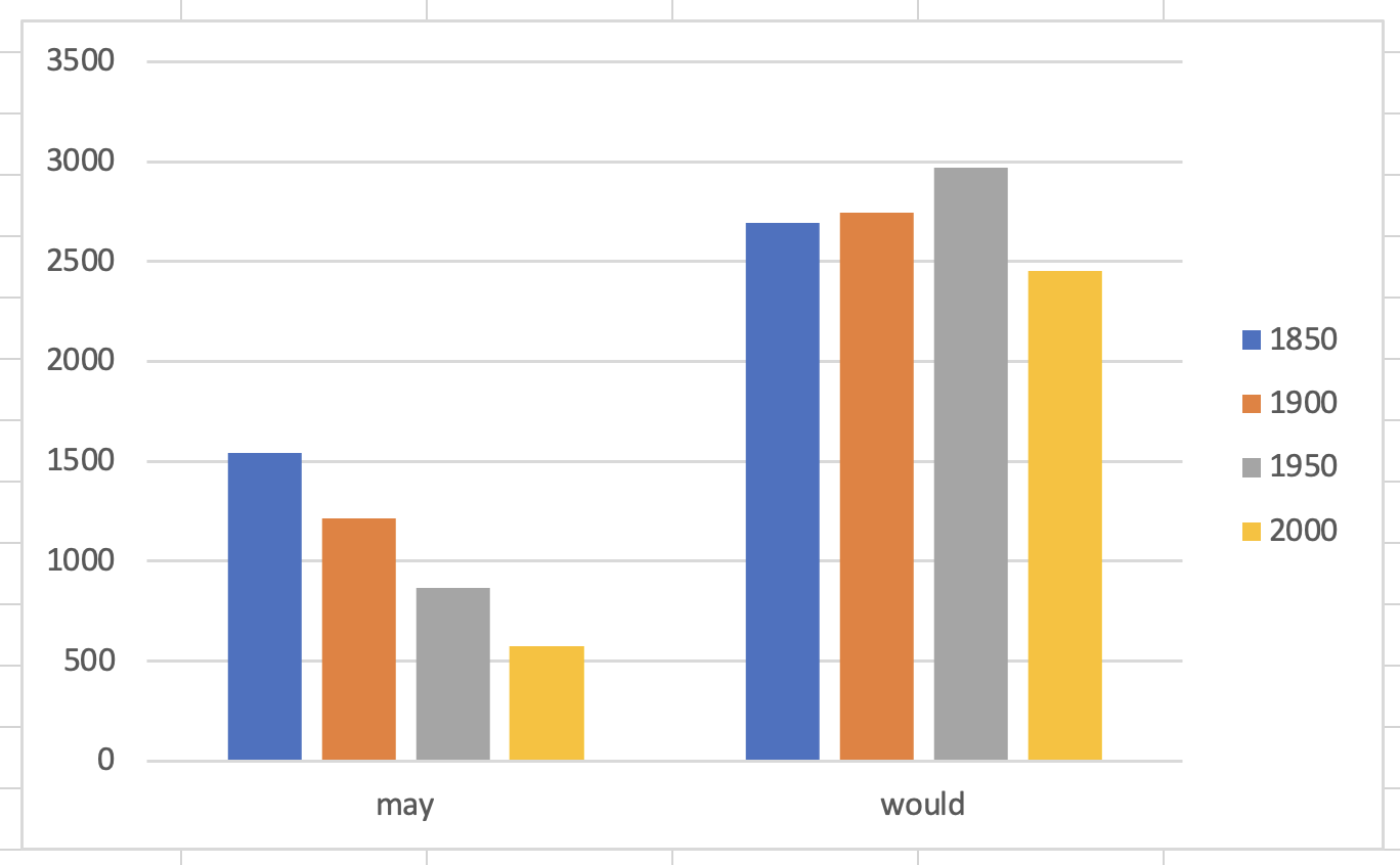Frequency changes of modal verbs over time.